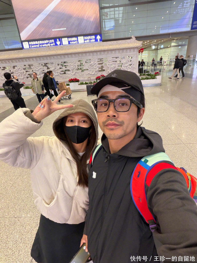 弦子还晒出了他们一家三口在飞机上的照片,以及她和李茂在北京机场的合影。